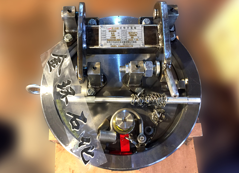 快開盲板是用于壓力管道或壓力容器的圓形開口上的一種機械裝置。一般由筒體法蘭、頭蓋、勾圈或卡箍、密封圈、安全聯(lián)鎖機構(gòu)、開閉機構(gòu)、轉(zhuǎn)臂及短節(jié)(需要時)等部件構(gòu)成。